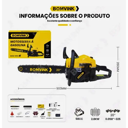 A Motosserra a Gasolina BOM-9203 é comercializada em kit completo, incluindo sabre de 20″, corrente, funil para abastecimento, ferramentas de manutenção, pastilha de freio extra, óculos de proteção, par de luvas e manual de instruções. Isso torna o produto pronto para uso imediato, atendendo tanto usuários domésticos quanto profissionais que necessitam de uma ferramenta confiável para o dia a dia.