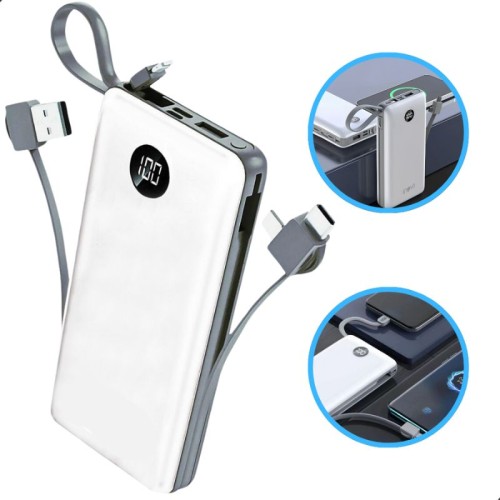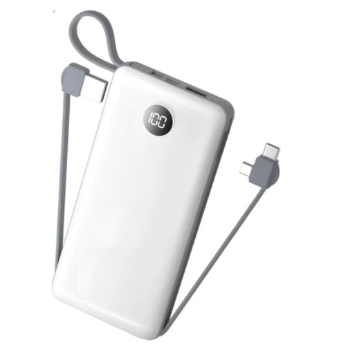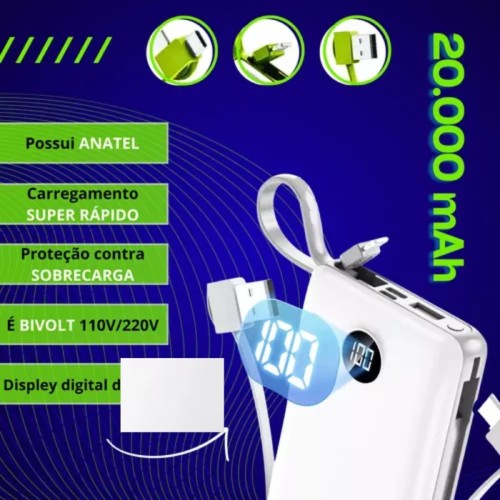 Este modelo é turbo, potente e seguro, com certificação Anatel, e conta com um display digital inteligente que indica com precisão o nível de carga restante. Acompanha cabos integrados compatíveis com Lightning, Tipo C e V8, além de entrada USB adicional para você usar o cabo original do seu aparelho. Tudo isso em um design compacto, moderno e resistente, que cabe facilmente na mochila ou bolsa.