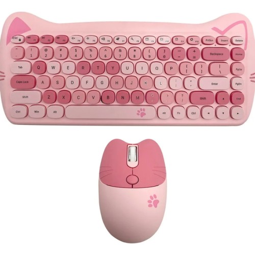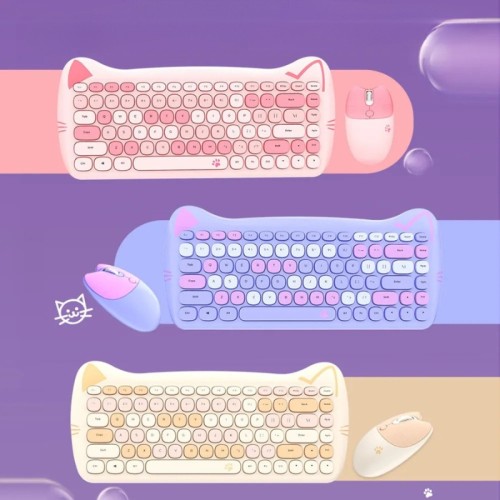 kit Teclado e Mouse Sem Fio Gatinho Fofo USB Colorido Candy Macio e Confortável + Mouse Pad