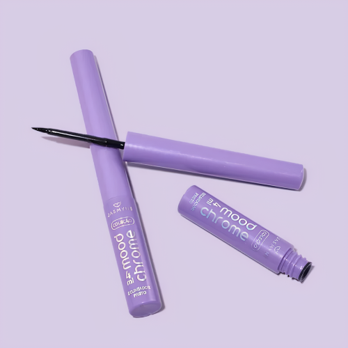 O Delineador Líquido Preto Coleção Mood Chrome da Jasmyne possui um pincel aplicador com ponta fininha e durinha que ajuda na hora de aplicar o delineador, deixando o traço bem preciso.