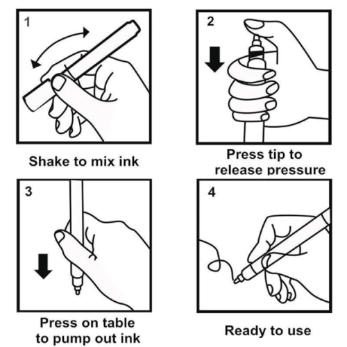 - A Tinta sai após 3 vezes de pressionar a ponta no papel ou superfície de uso.