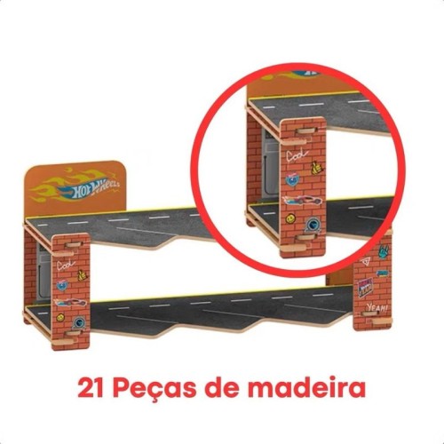 Composto de 21 peças em madeira reflorestada, este brinquedo possibilita a montagem de uma mini garagem e rampa através do encaixe de suas peças, que pode ser adicionado aos outros modelos de Playsets Hot Wheels da linha e construir a sua super pista!