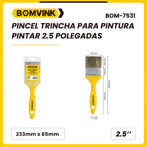 O pincel trincha Bomvink 2,5 polegadas é ideal para pinturas em paredes, madeiras, metais e diversas superfícies. Possui cerdas resistentes que proporcionam melhor acabamento, cabo anatômico de plástico ABS para maior conforto e durabilidade, além de ser fácil de manusear.