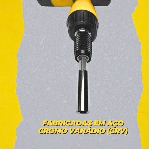 Produzido em aço cromo-vanádio de alta resistência, o kit garante maior durabilidade, resistência à oxidação e desempenho superior em usos contínuos. Acompanha maleta plástica organizadora, que facilita o transporte e mantém todas as peças bem acomodadas.