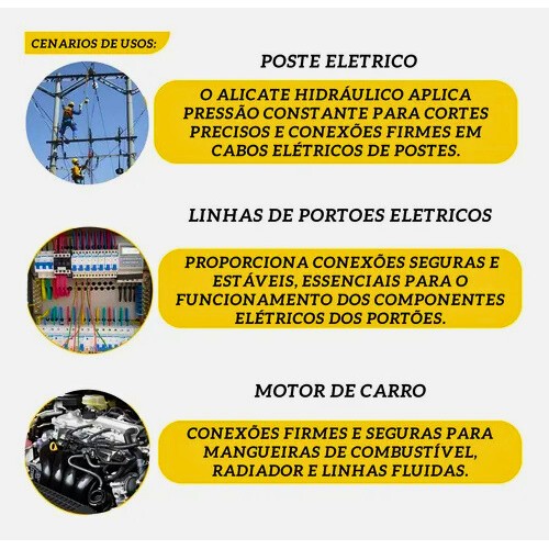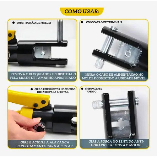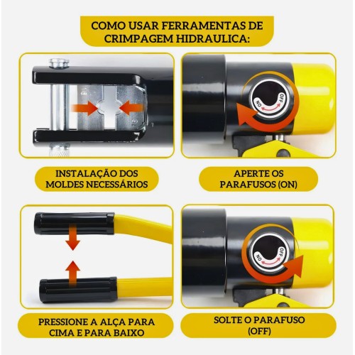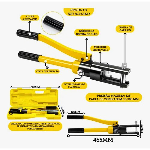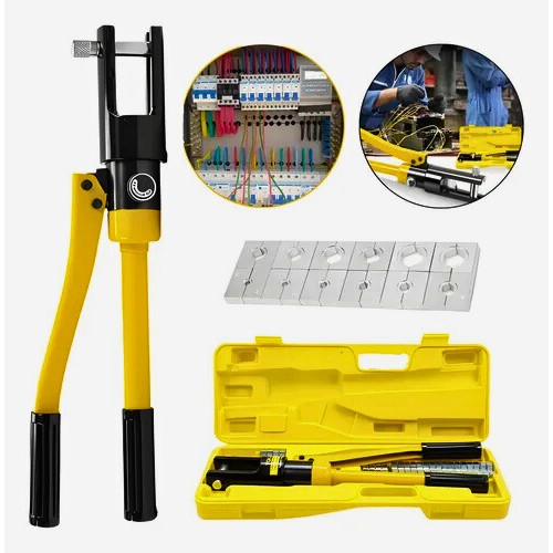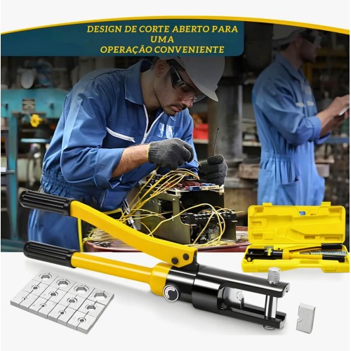 O Alicate Hidráulico Tipo Prensa é uma ferramenta profissional projetada para crimpagem de terminais e emendas em condutores elétricos de média e grande seção. Compacto, robusto e portátil — geralmente fornecido com maleta rígida e um conjunto de matrizes — este equipamento é ideal para eletricistas, equipes de manutenção industrial, montadores de painéis e empresas de energia que precisam de crimps confiáveis e repetíveis em cabos de 10 até 300 mm².