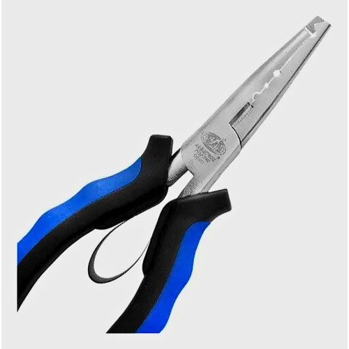 O cabo ergonômico com revestimento antideslizante contribui para uma pegada firme e confortável, diminuindo o risco de escorregões mesmo com as mãos molhadas. Há ainda furo no cabo para encaixe de “salva-alicates”, o que facilita o transporte seguro e evita perdas acidentais durante a pescaria.