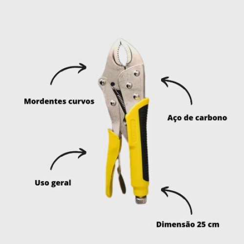 Este alicate de pressão é projetado para oferecer excelente desempenho em tarefas que exigem aperto firme e seguro. Seu mordente curvo permite acesso a áreas de difícil alcance, tornando-o versátil para diversas aplicações.