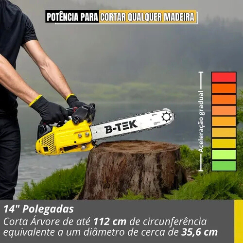A Motosserra a Gasolina B-TEK BT-DZ46 com sabre de 14" é uma ferramenta robusta e prática, desenvolvida para oferecer alto desempenho em cortes de madeira, galhos e troncos de pequeno a médio porte. Equipada com motor a gasolina de 25,4 cc e potência de 2.800 W, garante força, eficiência e autonomia para trabalhos em áreas rurais, jardinagem, carpintaria e manutenção em geral.