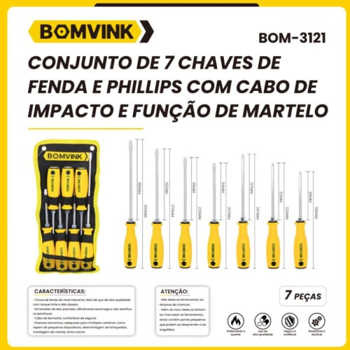 O Conjunto BOM-3121 foi desenvolvido para quem busca resistência, durabilidade e versatilidade em suas ferramentas. Produzidas em aço de alta qualidade, as chaves possuem cabo ergonômico com função de impacto e martelo, proporcionando maior firmeza e segurança durante o uso.