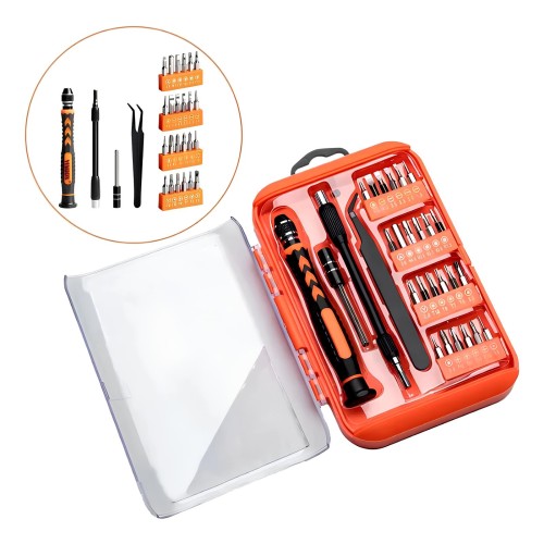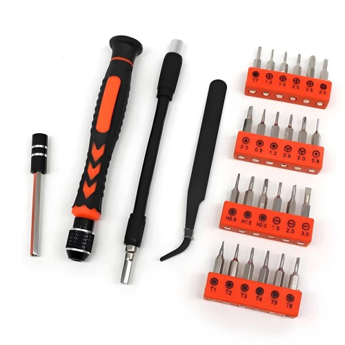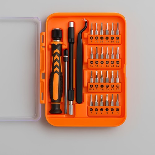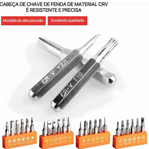 Conjunto ideal para reparos eletrônicos e trabalhos de precisão, contendo diversas pontas intercambiáveis, chave com cabo ergonômico, hastes extensíveis e ferramentas auxiliares para desmontagem segura.