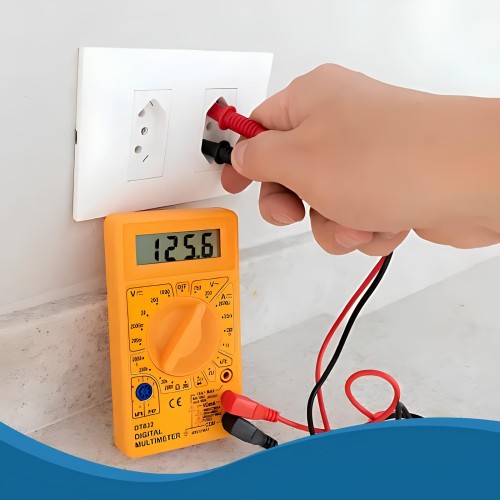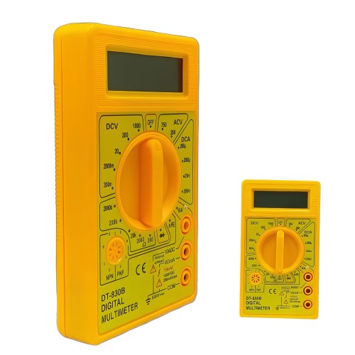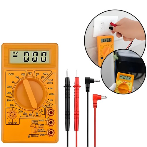 O Multímetro Digital é um instrumento portátil e prático, ideal para medições de tensão contínua (DCV), tensão alternada (ACV), corrente contínua (DCA), testes de resistência, diodo e transistores. Possui visor digital para fácil leitura e seletor giratório para troca rápida das funções.