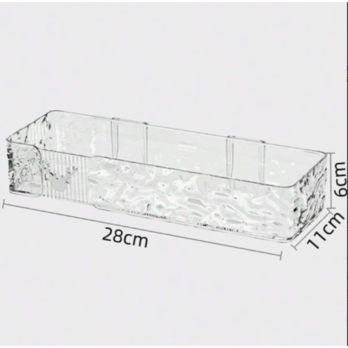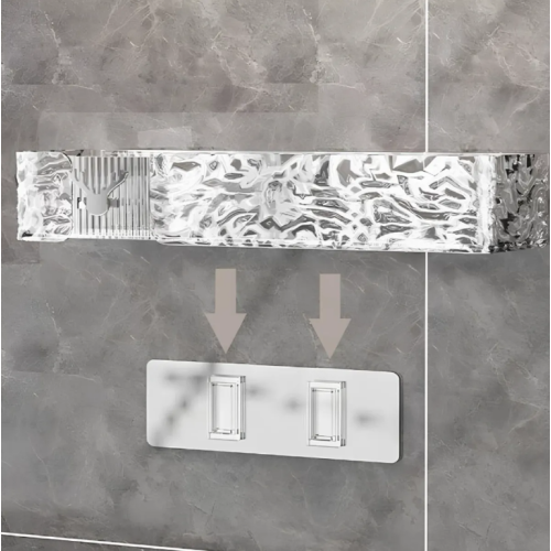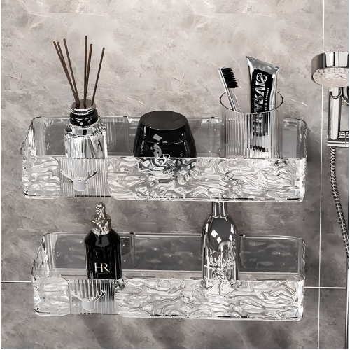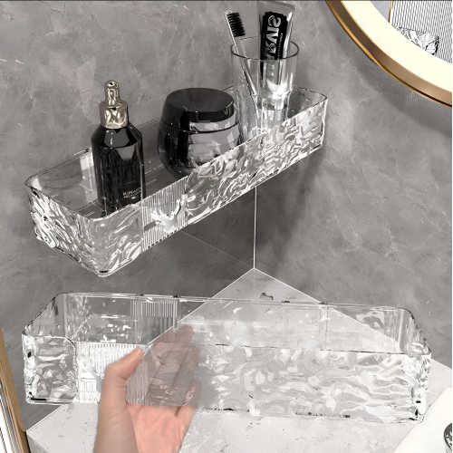 Essa prateleira de canto é feita em acrílico transparente texturizado, resistente e moderno, ideal para armazenar shampoos, cremes, perfumes e acessórios de higiene pessoal.