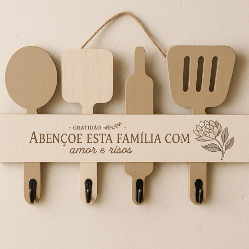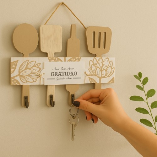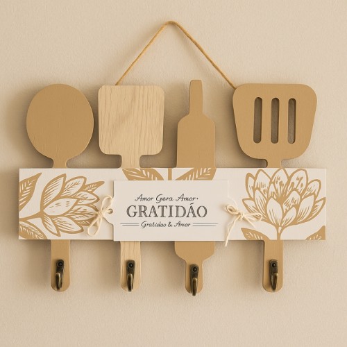 Este charmoso ornamento porta-chaves é confeccionado em MDF e possui design criativo inspirado em utensílios de cozinha, ideal para trazer um toque acolhedor e funcional à decoração. Decorado com detalhes florais e a palavra “Gratidão” em destaque, é perfeito para pendurar chaves, pequenos acessórios ou até mesmo utensílios leves.