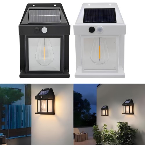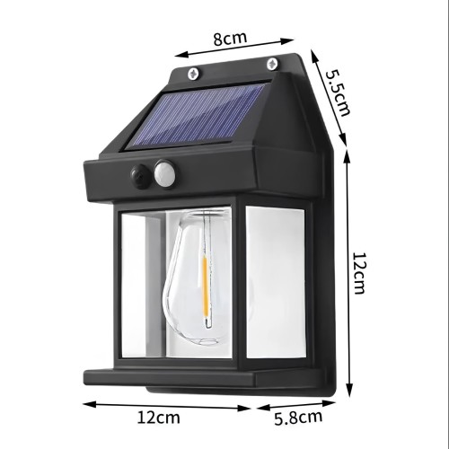 Lâmpada solar de parede com filamento de tungstênio, equipada com modo sensor de movimento, carregamento solar e bateria de 1200mAh. Ideal para iluminação externa sustentável e eficiente.