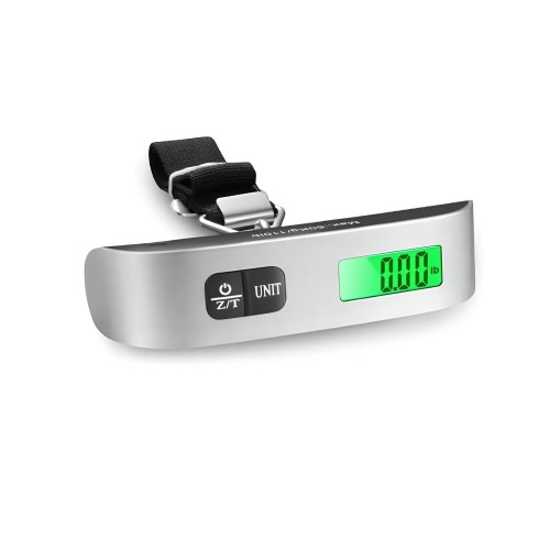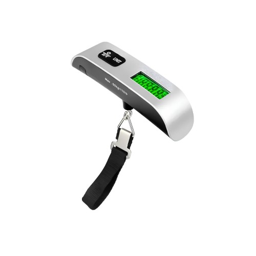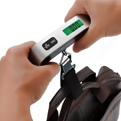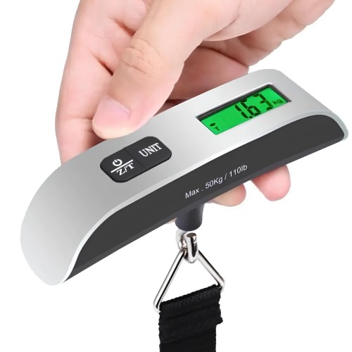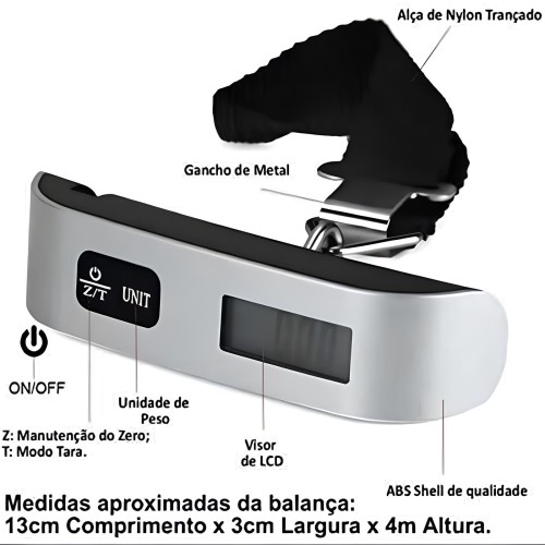 Balança portátil para bagagens com capacidade máxima de 50 kg, visor digital LCD, função de mudança de unidade (kg/lb), indicador de temperatura e alimentação por bateria CR2032. Ideal para evitar excesso de peso em viagens.
