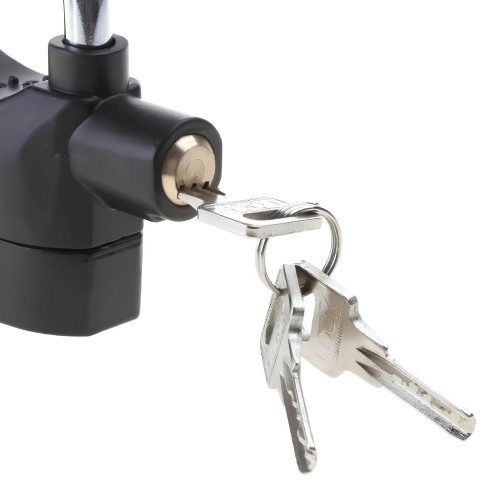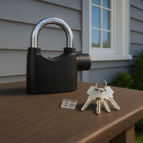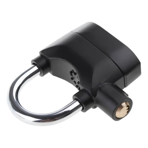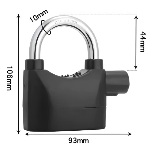 Cadeado de alta segurança com alarme sonoro de 110 dB, ideal para motos, portões e bicicletas. Possui arco de 10 mm de diâmetro, resistente a impactos e corte, com sistema de detecção de movimento e vibração.