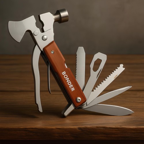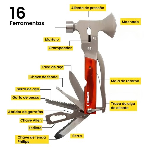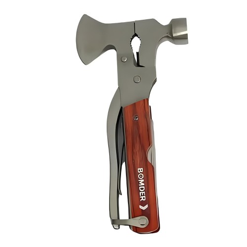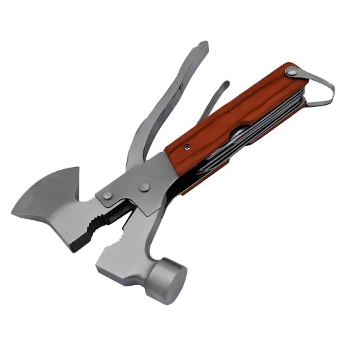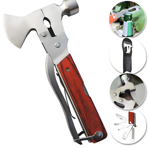 Ferramenta multifuncional 12 em 1, confeccionada em aço inoxidável com cabo em madeira, ideal para uso em acampamentos, pescarias, reparos domésticos e atividades ao ar livre. Possui martelo, machadinha, faca, chave de fenda, serra, abridor, alicate e outros utensílios integrados, proporcionando praticidade e economia de espaço.