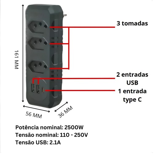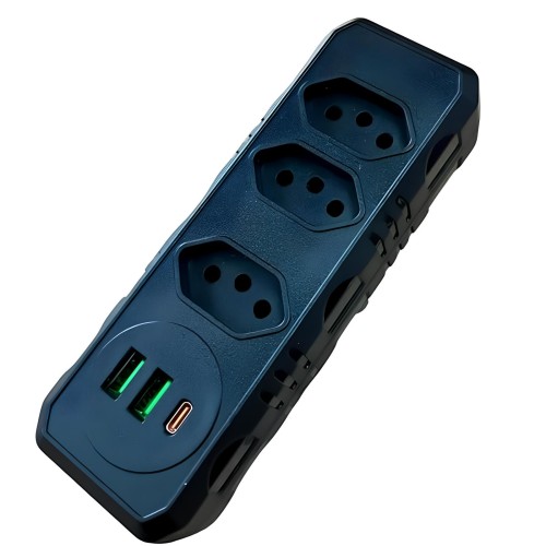 Adaptador de tomada, com capacidade máxima de 2500W e corrente de 10A. Possui 3 entradas universais compatíveis com diversos padrões de plugue, além de 2 portas USB e 1 porta USB tipo C para carregamento rápido de dispositivos como celulares, tablets, câmeras e outros equipamentos eletrônicos. Ideal para uso doméstico ou escritório.