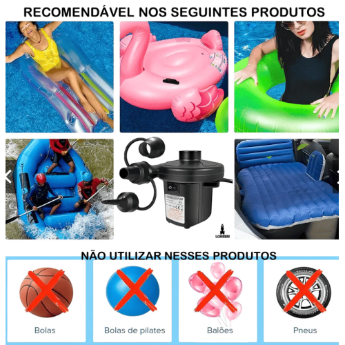 Conta com a função Infla e desinfla. Não Utilizar em: Bolas, Balões e Pneus. Nunca exceda 15 minutos de operação contínua.