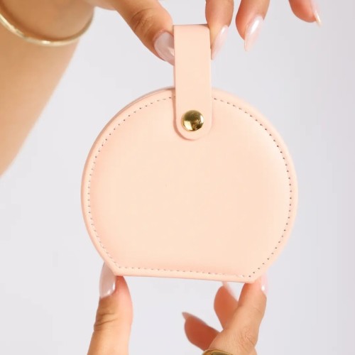 Disponível em cores suaves e com fecho de botão metálico, combina praticidade e estilo, sendo perfeito para uso doméstico ou para levar em viagens, mantendo suas joias sempre seguras e bem organizadas.