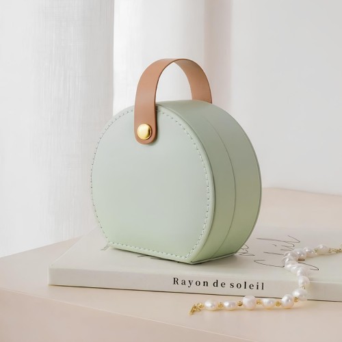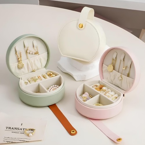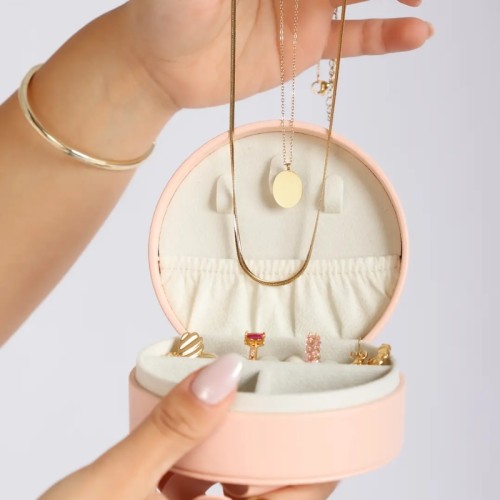 Porta-joias redondo e compacto, ideal para organizar e proteger suas peças favoritas com elegância. Produzido em material resistente com acabamento sofisticado, conta com divisórias internas acolchoadas para anéis, brincos, colares e pulseiras, além de bolsos elásticos para manter correntes no lugar.
