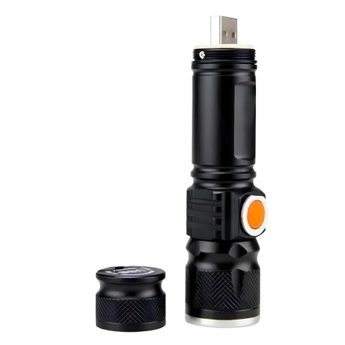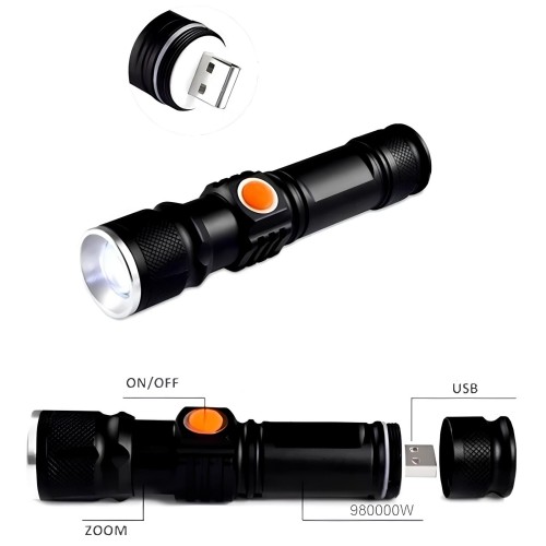Lanterna portátil com corpo em liga de alumínio, resistente e leve, ideal para uso em atividades externas, camping, trilhas, pesca ou como equipamento de emergência. Possui função de zoom ajustável para focar ou expandir o feixe de luz, além de botão liga/desliga de fácil acesso. Recarregável via porta USB, dispensando o uso constante de pilhas.