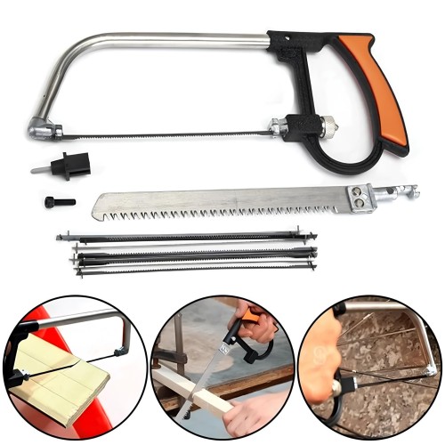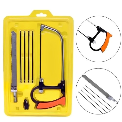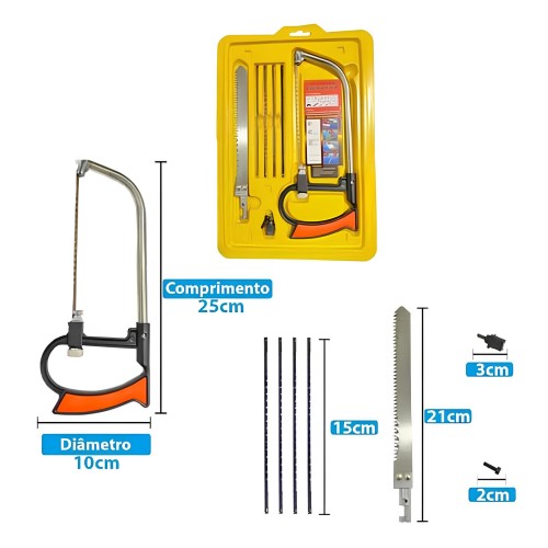 Serra manual multifuncional com kit de lâminas intercambiáveis, ideal para cortar madeira, plástico, metal e outros materiais leves. Possui cabo ergonômico para melhor pegada e controle, além de lâminas de diferentes tamanhos e formatos para diversas aplicações. O conjunto acompanha maleta plástica organizadora para transporte e armazenamento seguro.