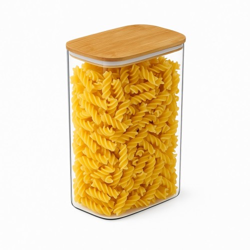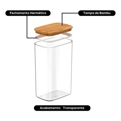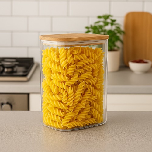 Pote hermético em vidro transparente com tampa de bambu, ideal para armazenar alimentos secos como massas, grãos, cereais e biscoitos, mantendo-os frescos por mais tempo. O vidro é resistente, fácil de limpar e não absorve odores, enquanto a tampa de bambu com anel de vedação em silicone garante fechamento seguro e proteção contra umidade.