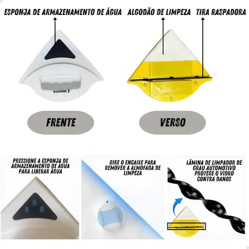 Limpador magnético de vidros , ideal para limpeza prática e eficiente de janelas, aquários e portas de vidro. Possui design triangular que alcança cantos com facilidade, empunhadura ergonômica e sistema magnético potente que mantém as partes firmemente unidas nos dois lados do vidro.