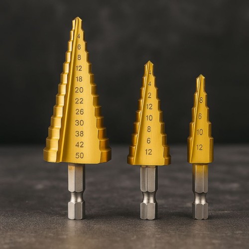 Jogo com 3 brocas escalonadas revestidas em titânio, ideais para perfuração de chapas metálicas, plásticos e outros materiais. O design escalonado permite perfurar múltiplos diâmetros com a mesma broca, garantindo cortes precisos e acabamento limpo. Possui encaixe sextavado para maior firmeza na fixação.