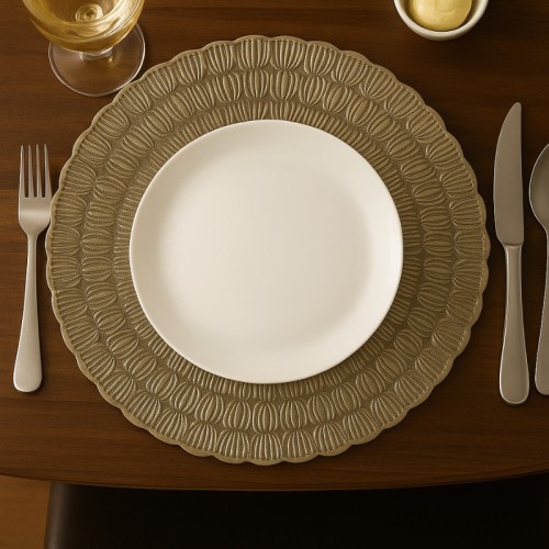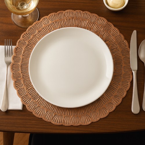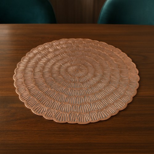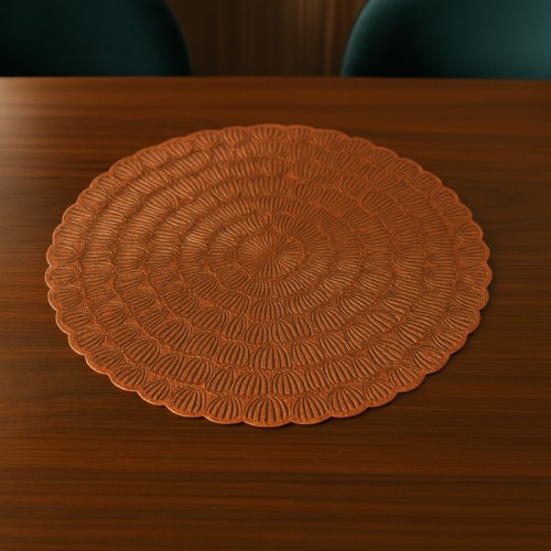 Um toque de sofisticação e modernidade à sua mesa com este Jogo Americano. Seu design circular e a textura detalhada em relevo criam um visual único e elegante, perfeito para refeições do dia a dia ou ocasiões especiais. A cor em tom de cobre ou bronze é versátil e combina harmoniosamente com diversos estilos de louças e decorações, protegendo sua mesa com muito estilo.