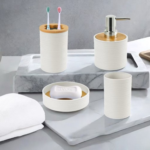 Transforme seu banheiro com este elegante kit de acessórios, que une praticidade e sofisticação. Produzido em cerâmica de alta qualidade com acabamento minimalista e detalhes em bambu natural, o conjunto traz um toque moderno e acolhedor ao ambiente.