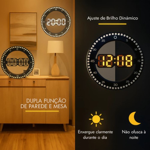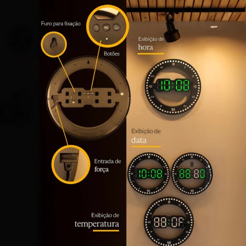 Transforme seu ambiente com o moderno Relógio de Parede Digital com Display LED, perfeito para casas, escritórios, comércios e consultórios. Com design minimalista e elegante, ele exibe hora, data, temperatura ambiente e ainda conta com função alarme, reunindo praticidade e estilo em um só produto.