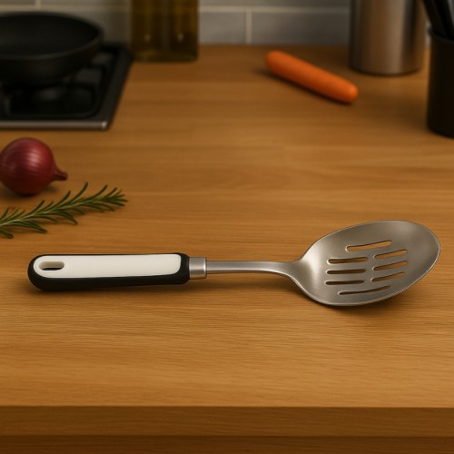Colher vazadora prática e resistente, ideal para escorrer líquidos de alimentos cozidos, como legumes, massas e frituras. Produzida em aço inoxidável de alta qualidade, garante durabilidade, resistência à corrosão e facilidade de limpeza.
