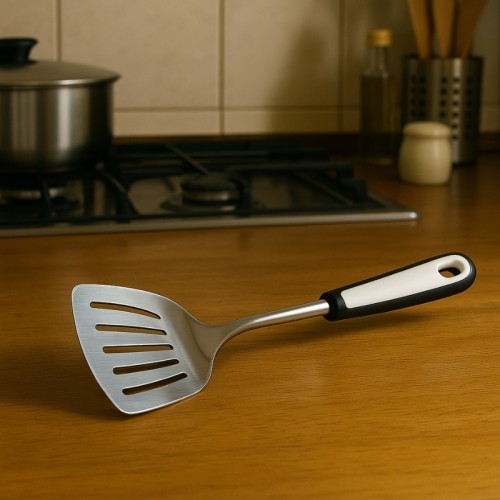 A Espátula Grande Luwave DCN18 é um utensílio de cozinha prático e durável, ideal para virar, manusear e servir alimentos durante o preparo. Sua lâmina em aço inoxidável conta com aberturas para facilitar o escoamento de líquidos e óleos, enquanto o cabo ergonômico em material antiderrapante proporciona firmeza e conforto no manuseio.