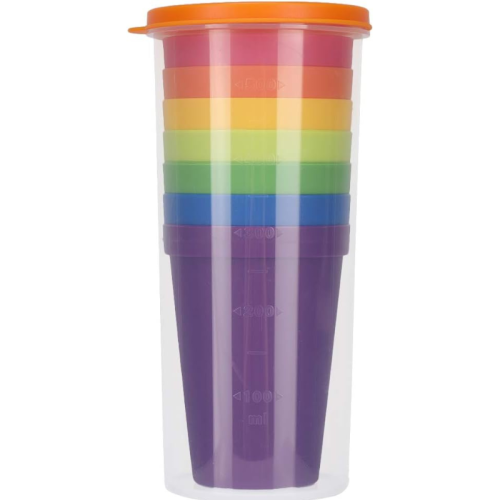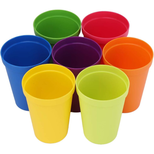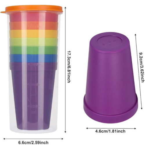 O conjunto vem com 6 copos empilháveis e uma tampa protetora, permitindo armazenar de forma higiênica e compacta, ideal para levar em viagens, piqueniques ou usar no dia a dia.