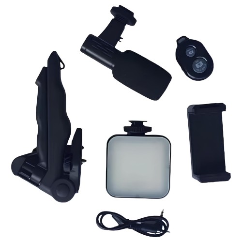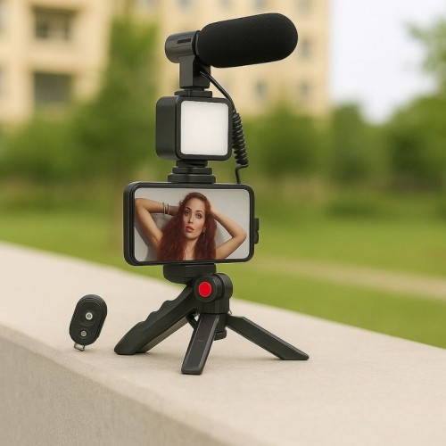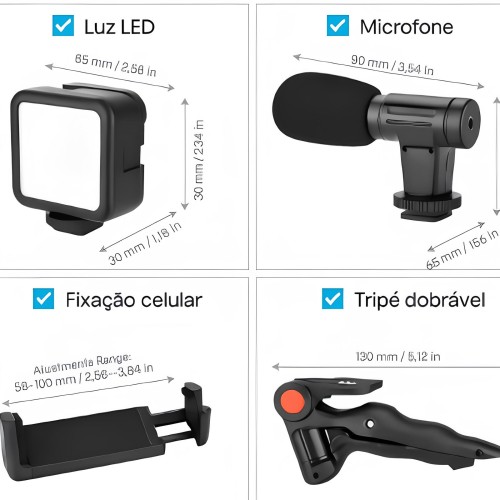 Conta com tripé dobrável, suporte ajustável para smartphone, microfone direcional de alta captação e luz LED com difusor, garantindo áudio claro e iluminação uniforme.