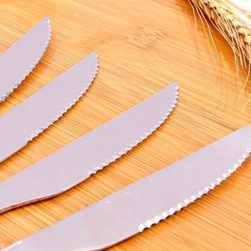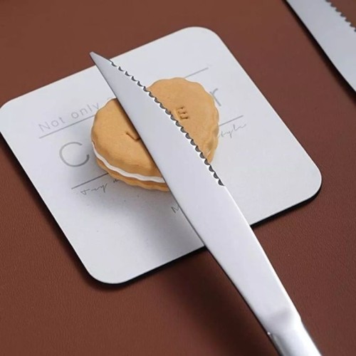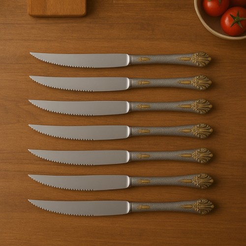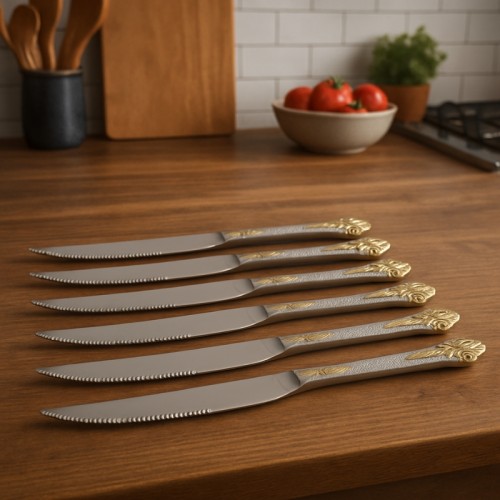 Kit com 6 facas de mesa em aço inoxidável, ideais para o dia a dia ou ocasiões especiais. Possuem cabo trabalhado com textura e detalhes dourados, que trazem sofisticação e elegância à mesa. Além do design diferenciado, são resistentes e de fácil limpeza.