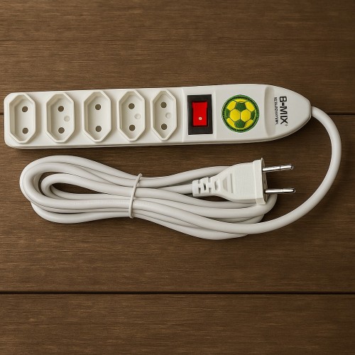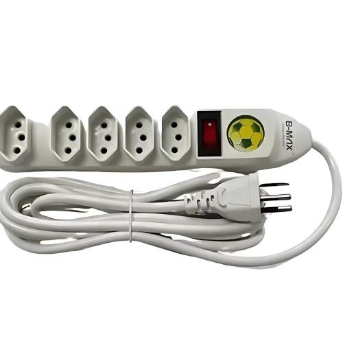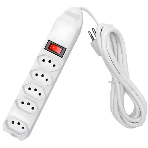 Régua de Extensão Elétrica 3 Metros. Possui 5 tomadas no padrão brasileiro (NBR 14136), botão liga/desliga com proteção e cabo reforçado. Ideal para conectar diversos aparelhos eletrônicos de forma prática e segura em casa ou no escritório.