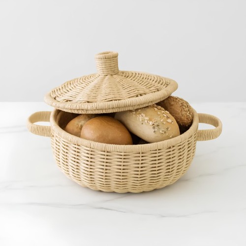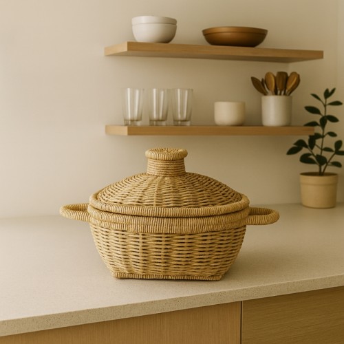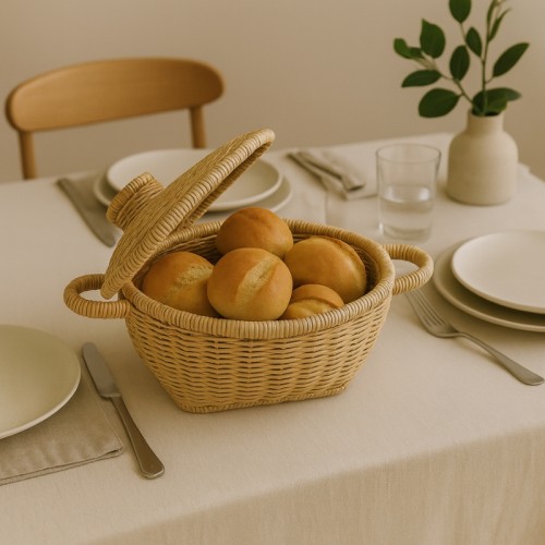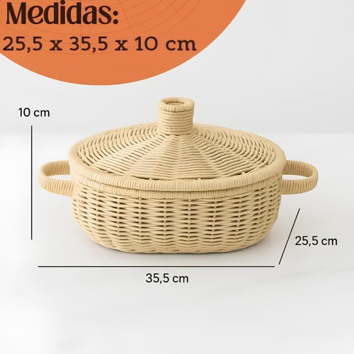 Cesto de mesa com tampa e alças laterais, feito em palha/trançado natural artesanal. Possui formato arredondado com bordas reforçadas e tampa com puxador central também em palha trançada. Ideal para servir pães, frutas ou armazenar utensílios de forma charmosa e rústica.