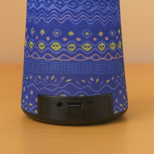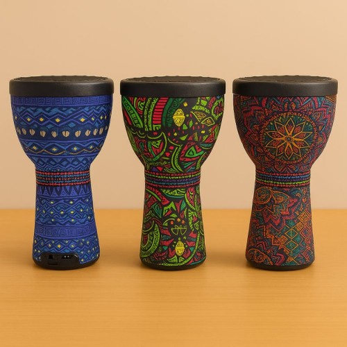 Design em formato de tambor étnico com luzes RGB, som potente e conexão Bluetooth sem fio. Conta com rádio FM, entrada USB, cartão de memória e auxiliar P2. Possui microfone integrado para chamadas, bateria recarregável e alça de transporte. Ideal para festas, praia, viagens e uso diário.