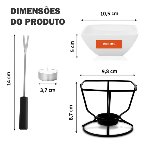 Acompanha garfinhos para mergulhar frutas, biscoitos e marshmallows.