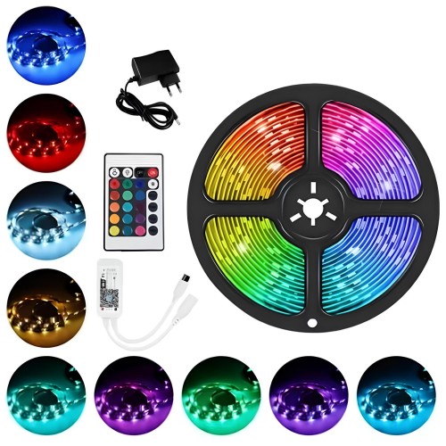 A Fita LED RGB com 3 metros é perfeita para decoração de ambientes, oferecendo iluminação colorida e personalizada. Acompanha controle remoto multifunções que permite escolher cores, modos de transição (flash, fade, smooth, strobe) e intensidade da luz. Fácil de instalar, pode ser aplicada em móveis, tetos, paredes, vitrines e veículos, criando efeitos modernos e sofisticados.