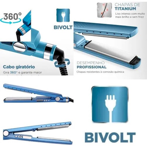 • Placas de Titânio: oferecem aquecimento rápido e uniforme, deslizando facilmente pelos fios sem puxar, garantindo resultado com brilho e maciez.