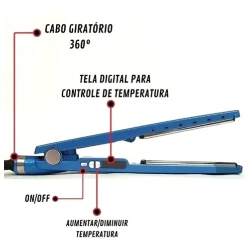 • Controle de Temperatura: possui até 5 níveis de ajuste, variando aproximadamente de 149 °C a 230 °C (450 °F), indicado para todos os tipos de cabelo — dos mais finos aos mais resistentes.