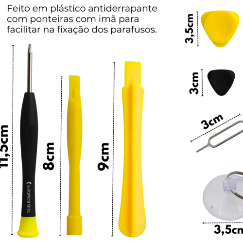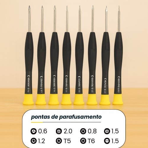 O Kit é ideal para manutenção e reparos de celulares, notebooks, videogames, eletrônicos e outros dispositivos que exigem ferramentas de precisão. Fabricado em plástico antiderrapante e resistente, com ponteiras metálicas imantadas que facilitam a fixação e remoção de parafusos pequenos.
