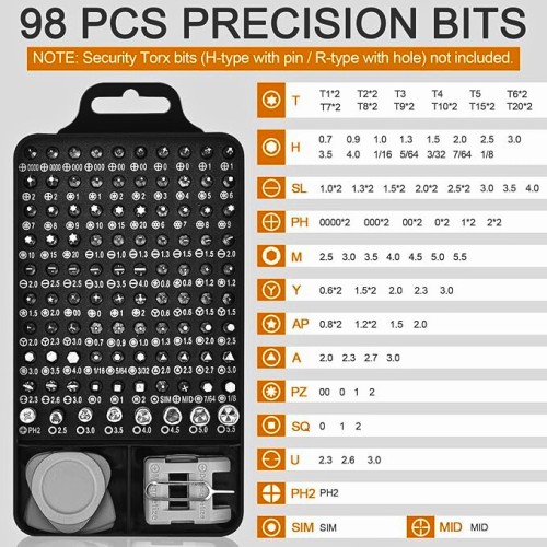 98 Bits de Precisão: Inclui diversas pontas, como Phillips, Pentalobe, Torx, Hexagonais, Triângulo, Y, U, entre outras, compatíveis com a maioria dos dispositivos.