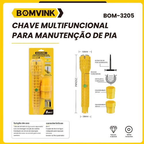 A Chave Multifuncional BOMVINK BOM-3205 foi desenvolvida especialmente para facilitar a manutenção de pias, torneiras e encanamentos em geral. Com design inteligente e ergonômico, ela é ideal para alcançar locais de difícil acesso, proporcionando praticidade e eficiência em diversas tarefas de instalação e reparo.