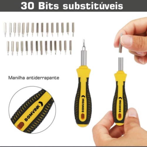 Kit de Chaves de Precisão com Ponteira Intercambiável – Ideal para manutenção de eletrônicos, celulares, óculos e pequenos reparos domésticos. Possui cabo ergonômico emborrachado que garante firmeza no manuseio e caixa organizadora com encaixes individuais para cada ponteira.