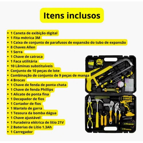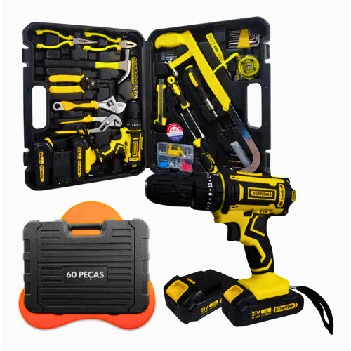 O Kit Oficina BOM-9910 é a solução completa para quem busca praticidade, organização e eficiência no dia a dia. Equipado com uma parafusadeira/furadeira 21V de alto desempenho, além de diversas ferramentas manuais essenciais, este conjunto é ideal tanto para uso profissional quanto doméstico.